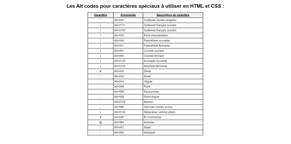 Ceci est un tableau regroupant les Alt code les plus souvent utilisés.