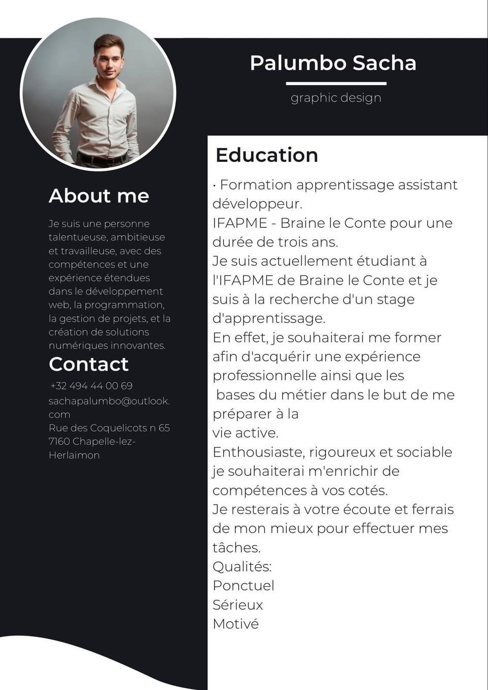 Je m'appelle Sacha Palumbo, un étudiant passionné âgé de 18 ans, actuellement inscrit à l'Ifapme de Braine-le-Comte. Nouveau dans le domaine, je suis enthousiaste à l'idée d'explorer et de développer mes compétences dans le monde passionnant de la création. Mon portfolio est une vitrine de mes premiers pas dans ce domaine dynamique. Je suis déterminé à progresser et à faire de mon mieux dans chaque réalisation. Merci de visiter mon portfolio et de partager ce voyage avec moi.