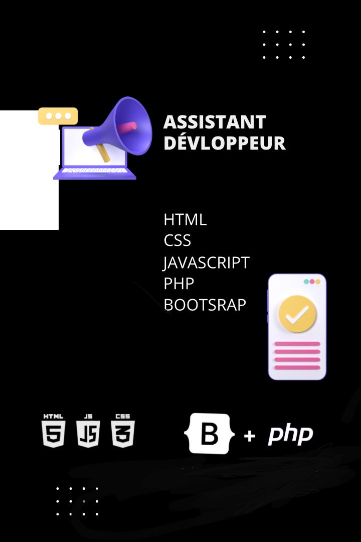Vous recherchez un développeur web polyvalent et créatif ? Ne cherchez plus ! Avec mes compétences en HTML, CSS, JavaScript, Bootstrap et PHP, je suis prêt à donner vie à vos idées les plus audacieuses. Je peux créer des sites web modernes, interactifs et esthétiquement plaisants, tout en assurant une expérience utilisateur exceptionnelle. Que ce soit pour concevoir une interface utilisateur intuitive, ajouter des fonctionnalités dynamiques ou optimiser la performance, je suis prêt à relever tous les défis. Faites confiance à mon expertise et laissez-moi vous aider à vous démarquer dans le monde du web